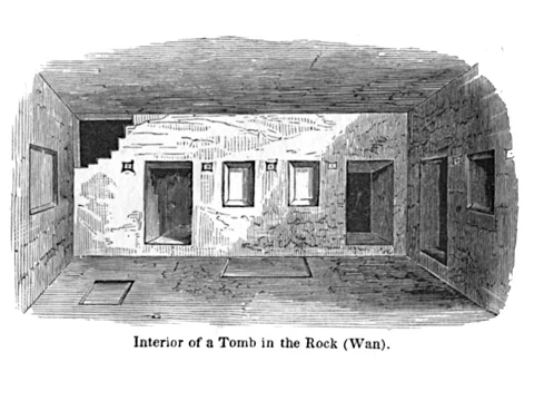Advancing from Bash-kalah to Van, Layard and Rassam investigated the citadel. In his description of the visit published in 1853, Layard describes the massif itself, the efforts to copy the inscriptions, and, most interestingly, a tomb known as the Khorkhor Mugaralari or the “Caves of Khorkhor.” The description of the installation is accompanied by two drawings. The first shows the tomb interior. A series of rectangular rooms are carved in solid rock. These are separated by doors. The walls and floors are graced by shallow niches (purpose unknown).