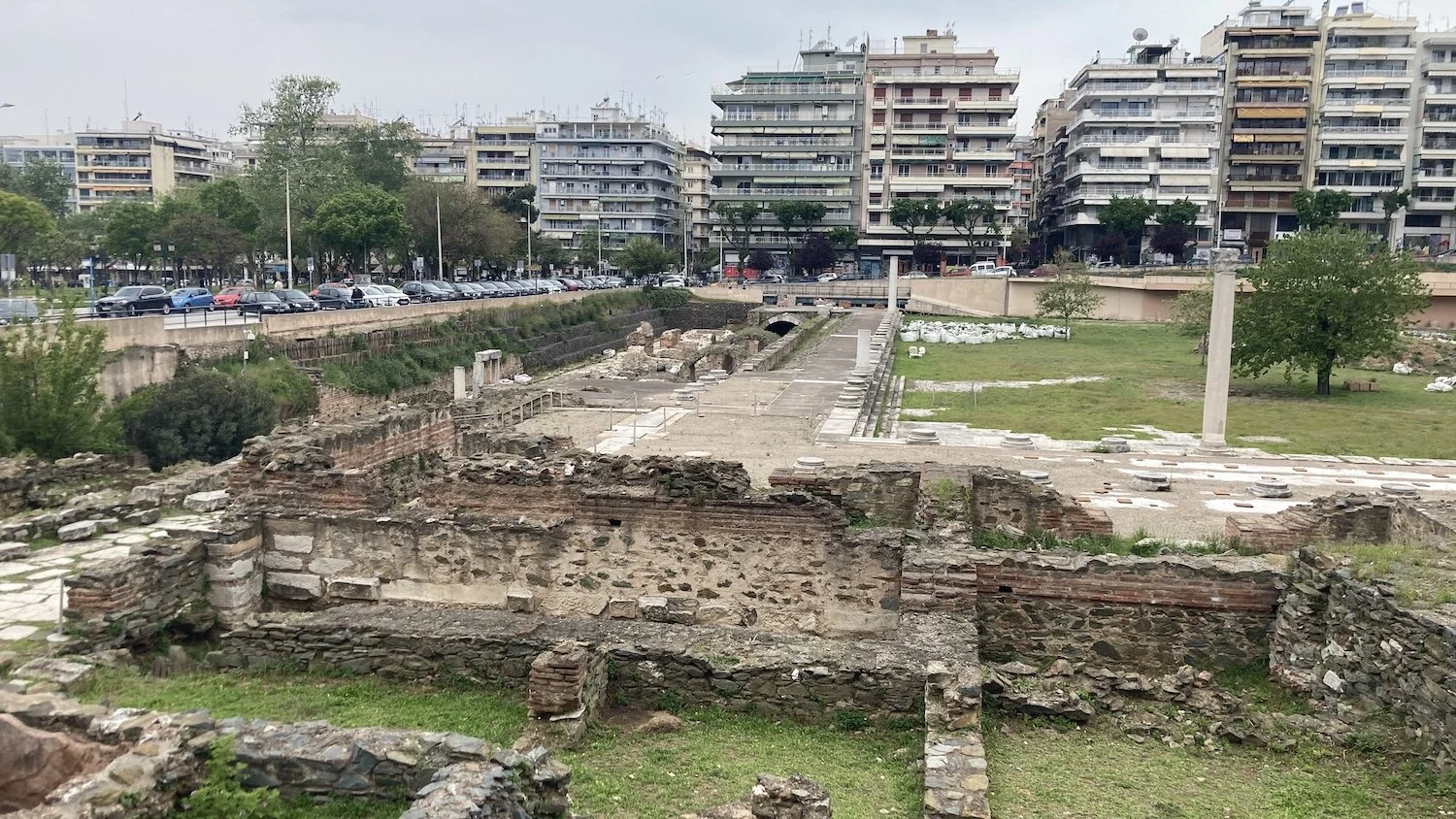 View to the remains of the Roman Market in downtown Thessaloniki.