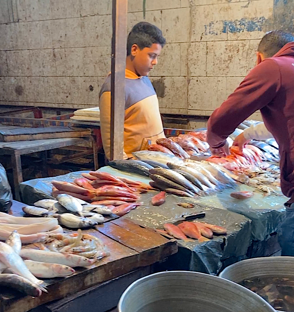 The tables are full of seafood at the Anfushi Fish Market in Alexandria, Egypt.