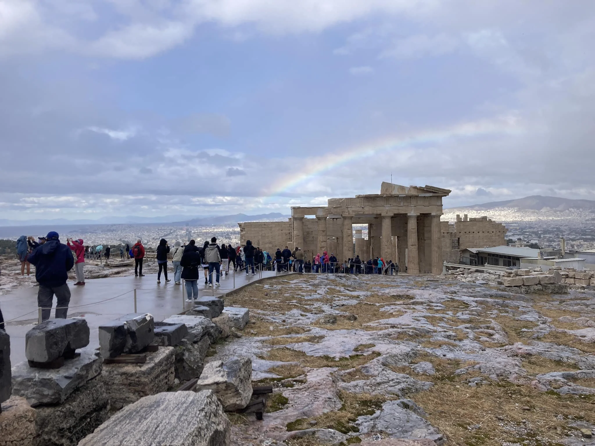 Mark Ziese April 20, 2024 Exploring Greece Athens Acropolis Mark Ziese April 20, 2024 Exploring Greece There was a rainbow over the monumental gate this morning. Athens, Acropolis.