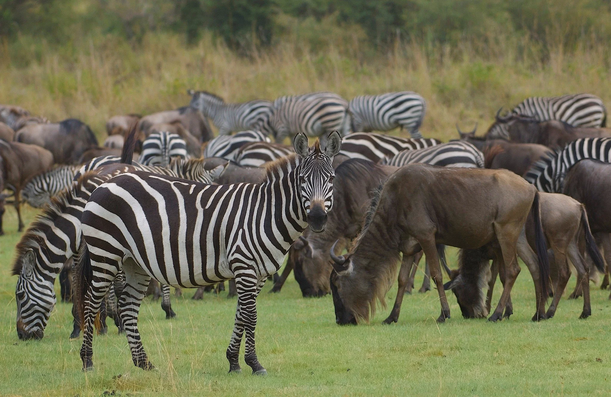 We usually think of the wildebeest (gnu) in the context of "the Great Migration" of the Serengeti. However, mixed in these traveling mega-herds are many other species, including zebras.