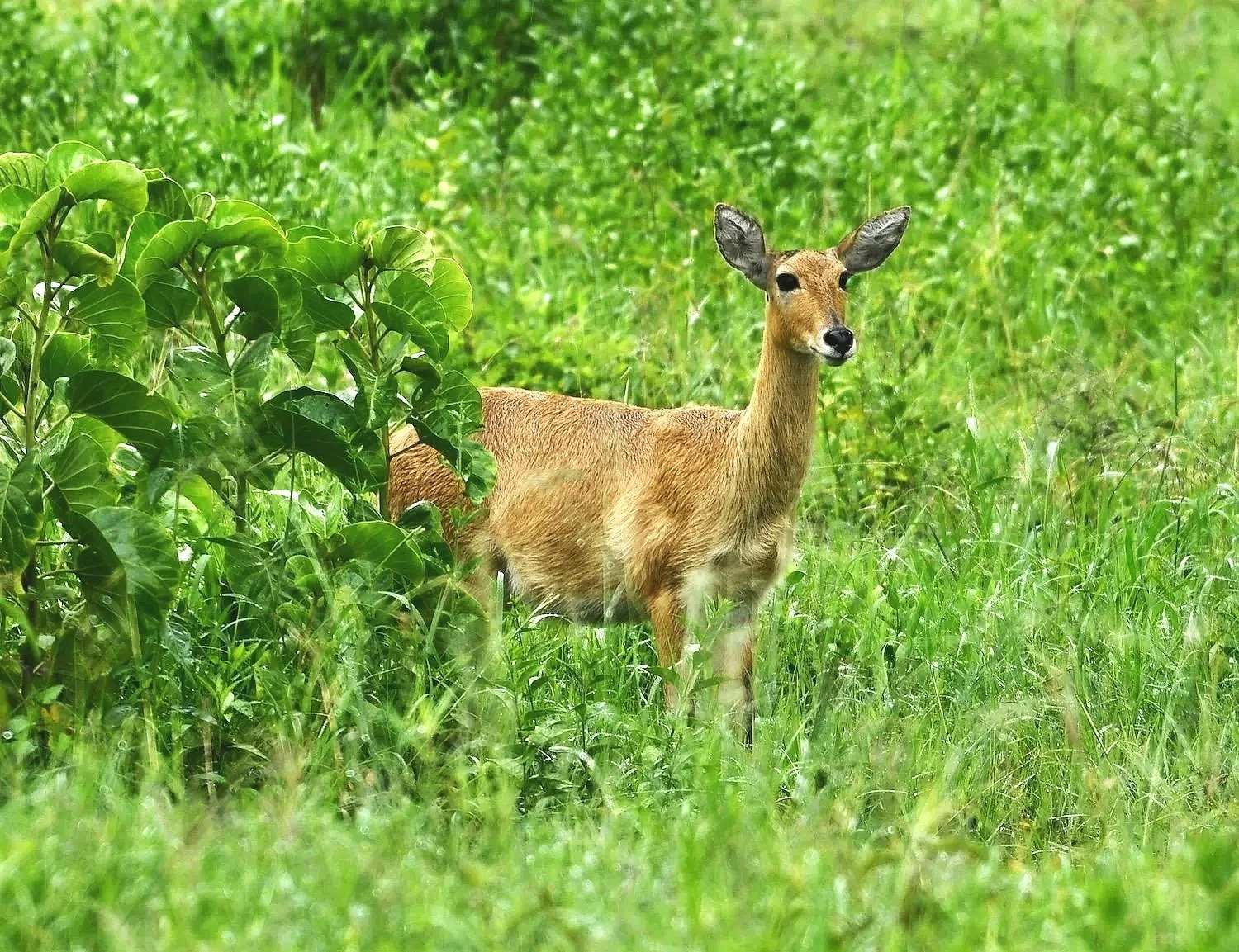 A reedbuck doe stands alert in the tall grass. While there is no set breeding season for reedbucks, breeding peaks in the rainy season.