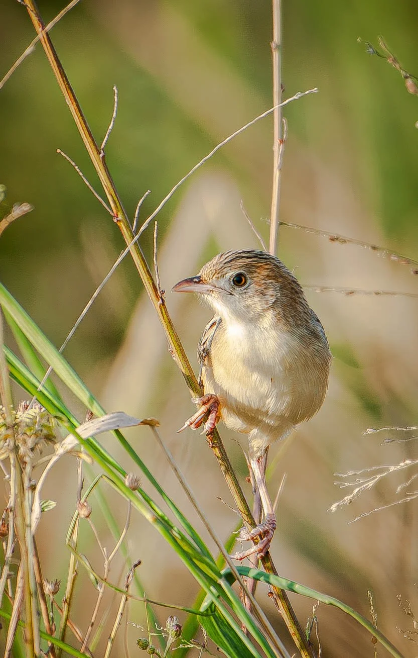 This one is puzzling to me. It has some canary colors, but the bill isn’t short and stout. Weaver family. No, markings not quite right. Maybe a Cisticola (a member of the warbler family)?