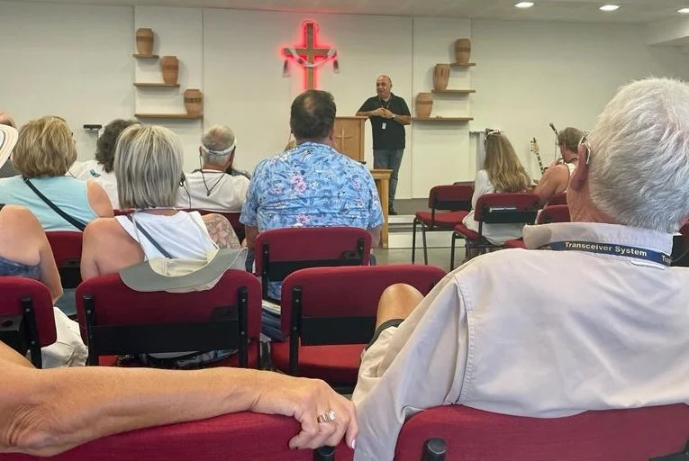 Pastor Hani of meets with American Christians at the Kfar Cana worship center.