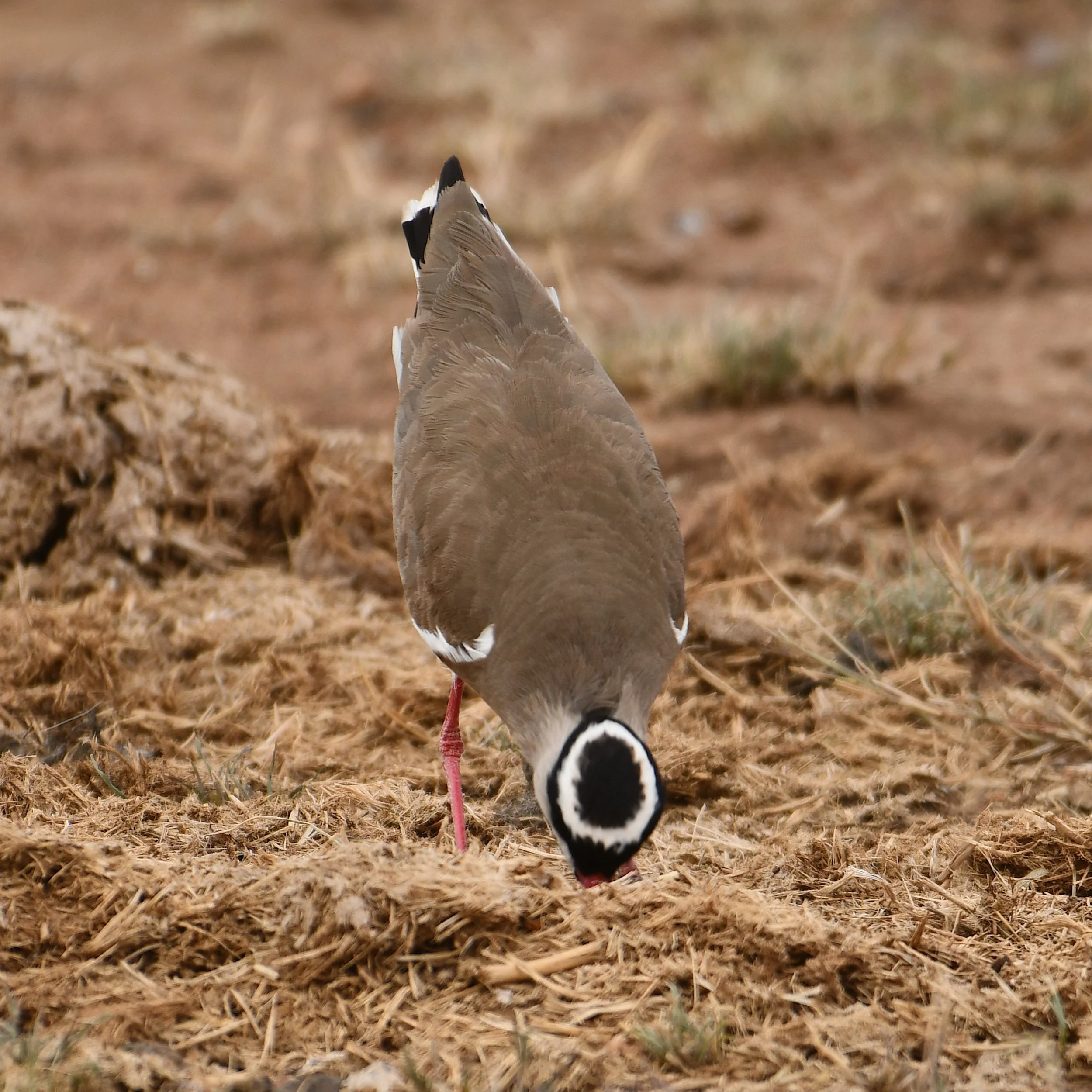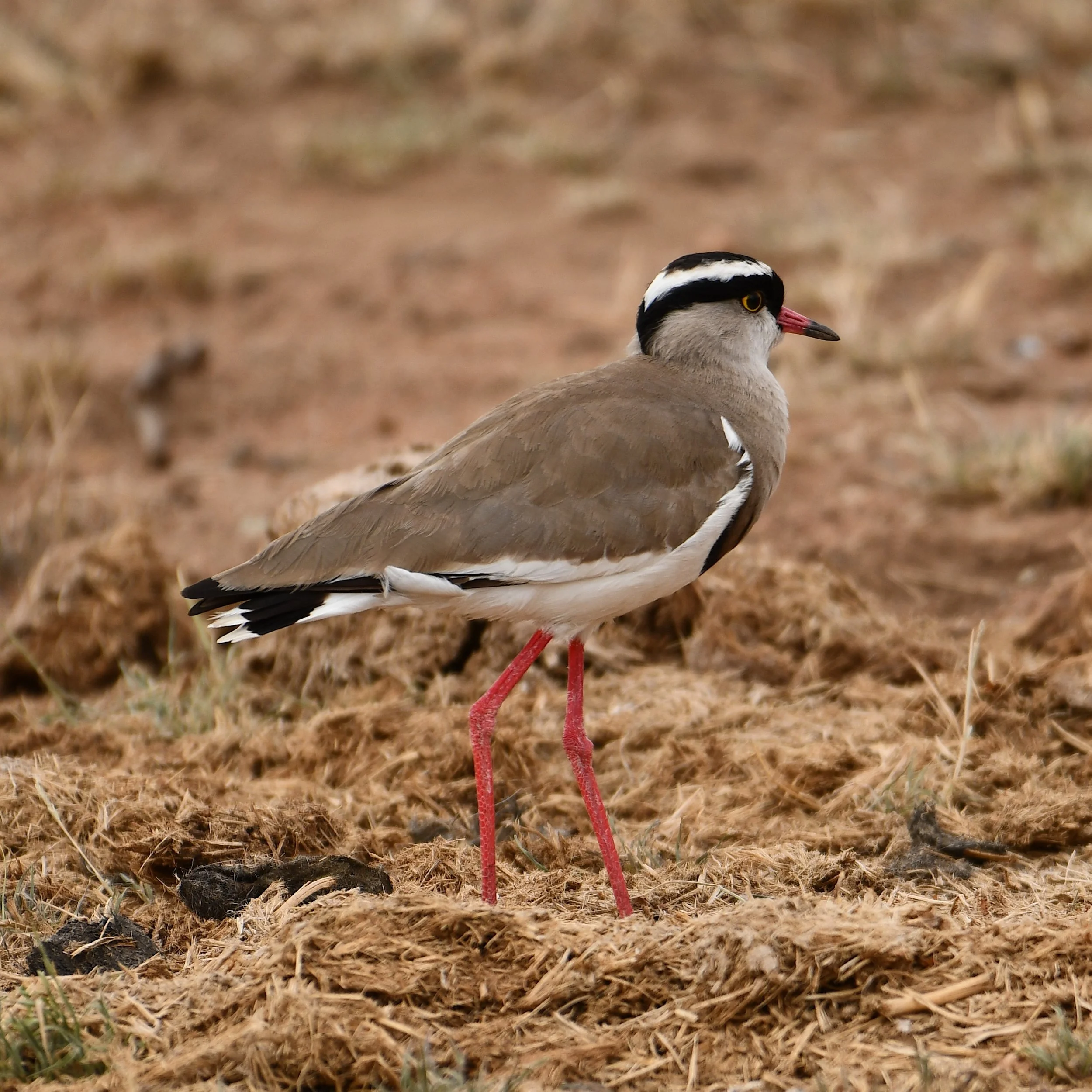 A Crowned Lapwing of Ngorongoro Crater, displaying its white halo crown, brown plumage, and bright red legs.