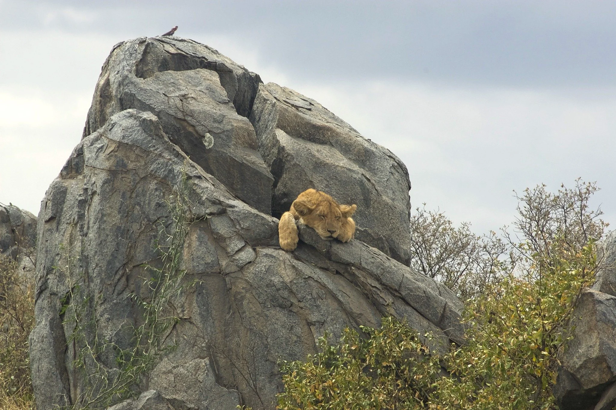 Young lion sleeping on a kopje. The kopje on the Serengeti is a hill that rises sharply from the surrounding plain. Made of granite, the kopje is a geological relic. The softer volcanic soil has eroded away, leaving this "basement" rock standing tall. Kopjes function as islands of life.