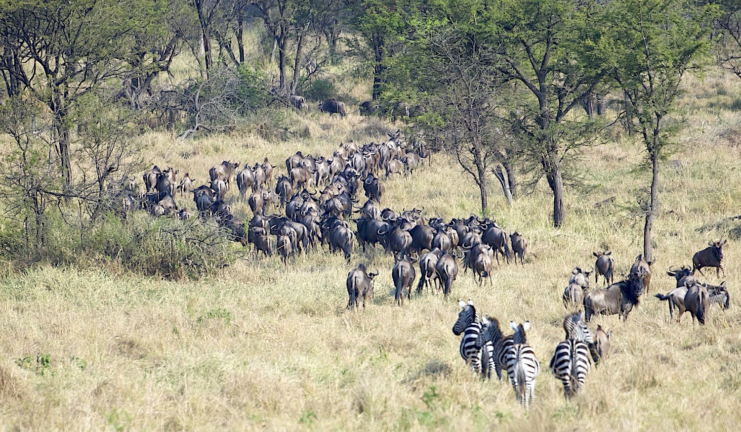 Herds of wildebeests and zebras moving through the northern Serengeti.