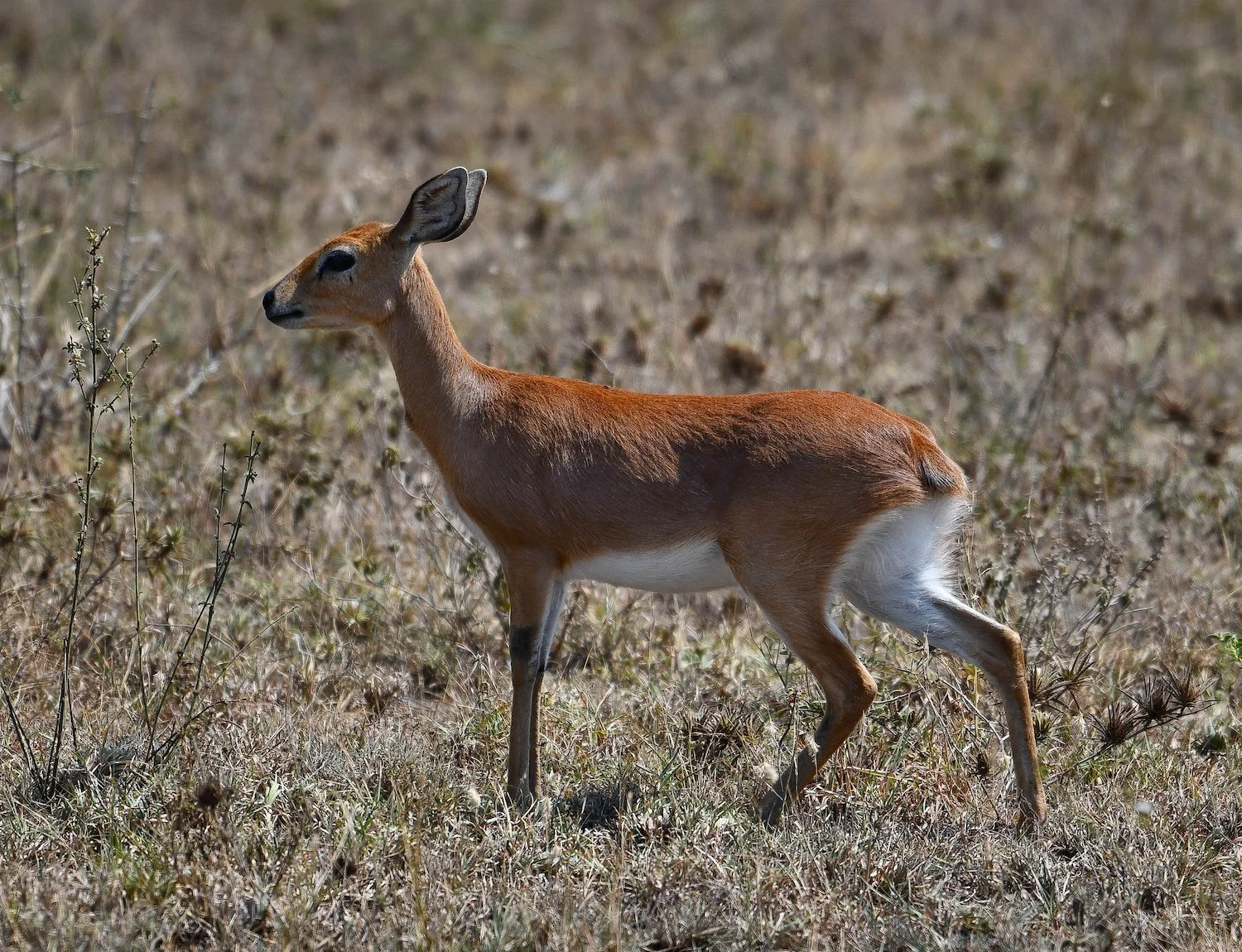 A petite female Steenbok with large ears standing in the grass of the Serengeti, Tanzania.