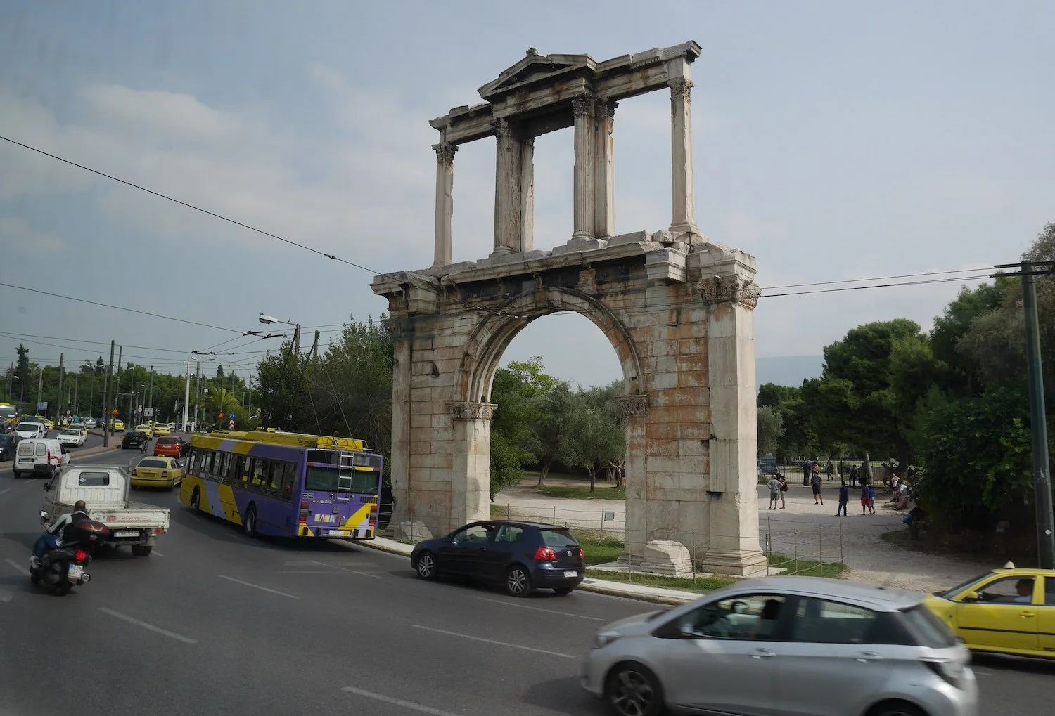 Cars and busses pass by Hadrian’s Arch today. It stands next to the busy street.