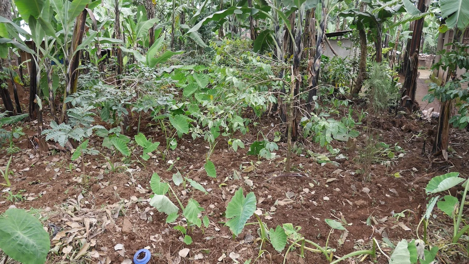A mix of coffee bushes and banana plants. Coffee bushes prefer shade.