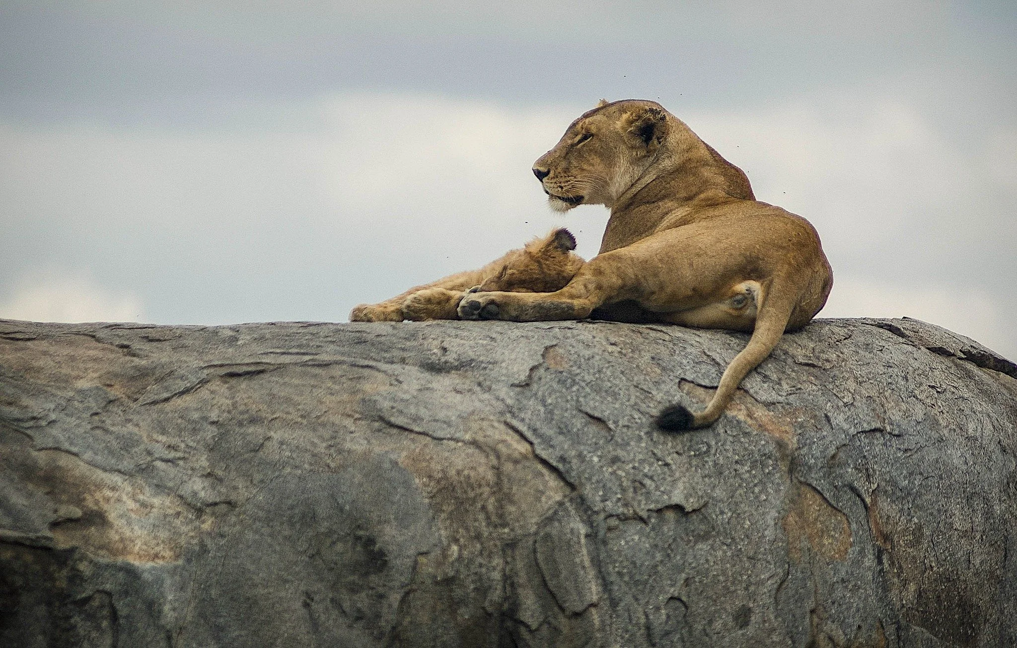 Lioness and cub on a kopje. Like islands in a vast sea, granite kopjes rise above the Serengeti grasslands and provide a special habitat for both plants and animals. On one, we found this lioness and cub enjoying the afternoon sun.
