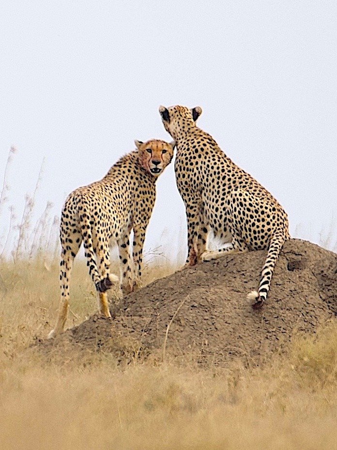 Cheetas poised on termite mound in the Serengeti.