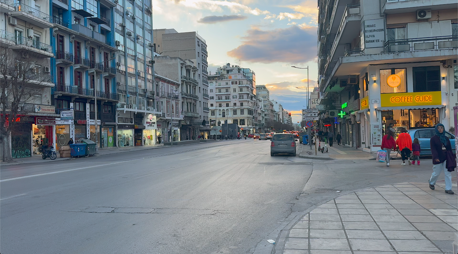 Click the panel to walk the streets of Thessaloniki.