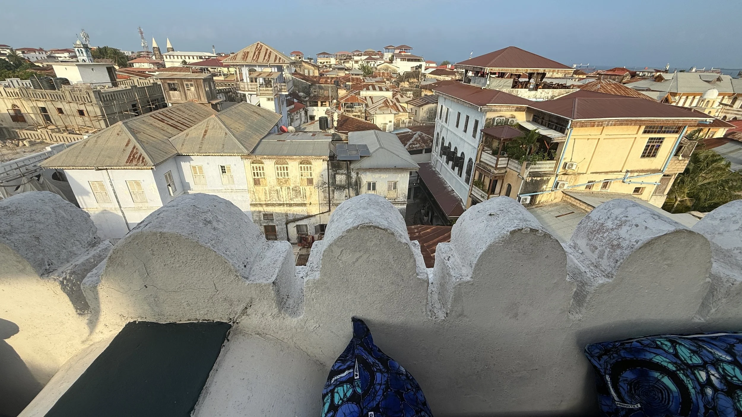I shot this view from the roof of our lodging, the Swahili house, a 19th c Indian merchantmen’s home. Note the crenellated parapets lining the top of the wall. While they look like a defensive feature, they are actually designed to give a little privacy to residents who uses the flat roof as living space.