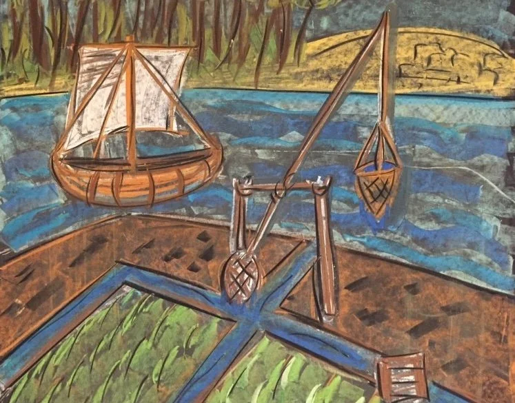 Illustration of life along the Nile, showing a boat, agricultural fields, canals, and a “water elevator.”