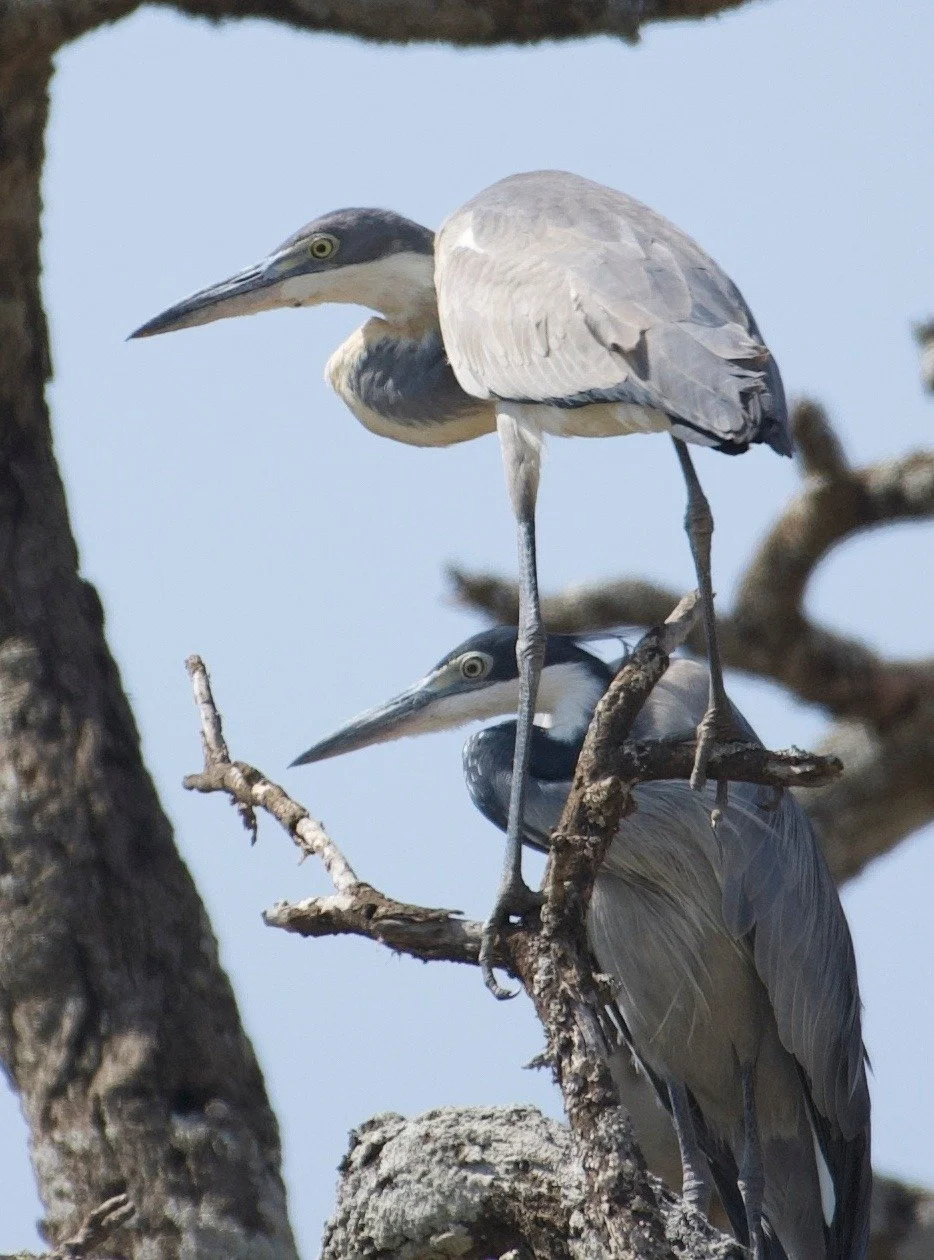 These guys stand motionless until they spear their prey in a flash. Came across a flock of Black-headed herons (Ardea melanocephala) hanging out in a tree. The Serengeti, Tanzania.