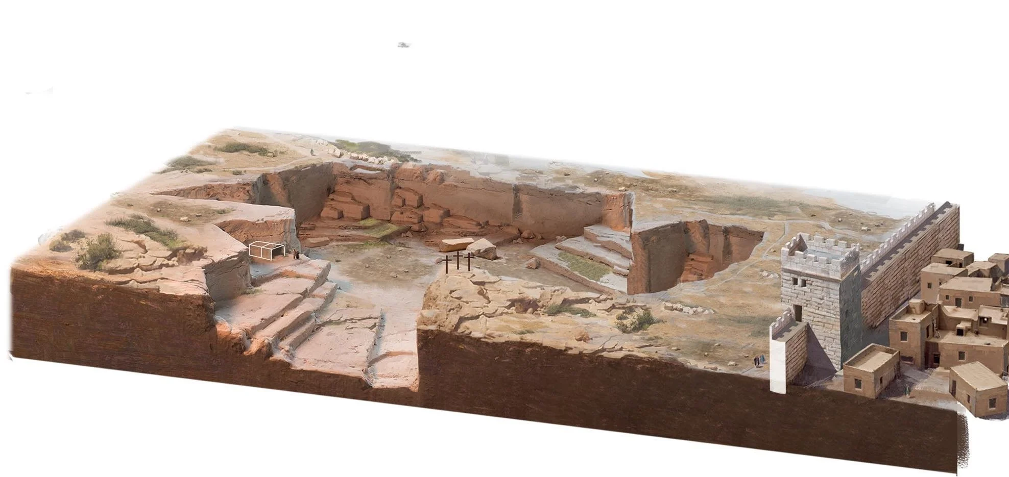 Fortunately, through digital reconstruction, it is not an impossible ask. Consider the careful illustration below produced by the good folks at National Geographic.* Note the quarried pits, the presence of the city wall on the right of the image, the position of the crosses on a nubbin of elevated stone in the middle, and the tiny outline of a tomb dug into the quarry wall on the left.