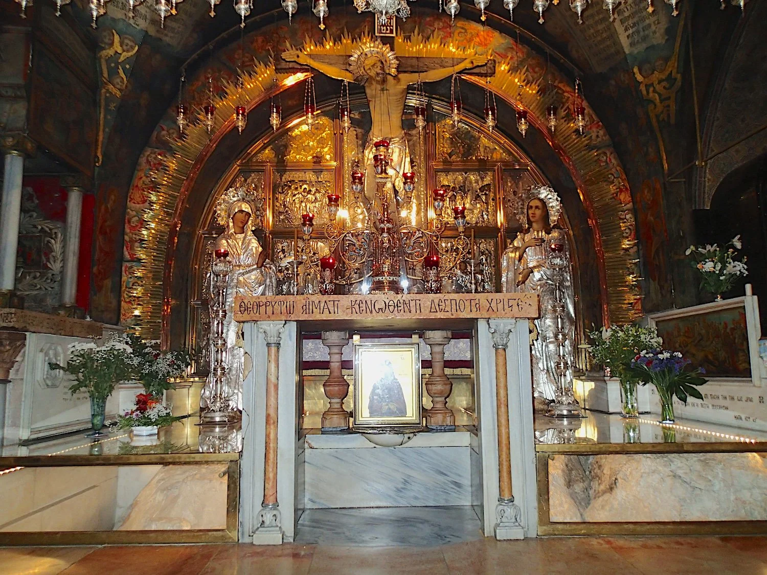 The Greek Orthodox Golgotha site. This is the traditional site where Christ was crucified inside the Church of the Holy Sepulchre. Note the yellowish stone framed on either side of the altar, near the floor. This stone under the glass is cracked and crumbly and ancient, left behind by the quarrymen.