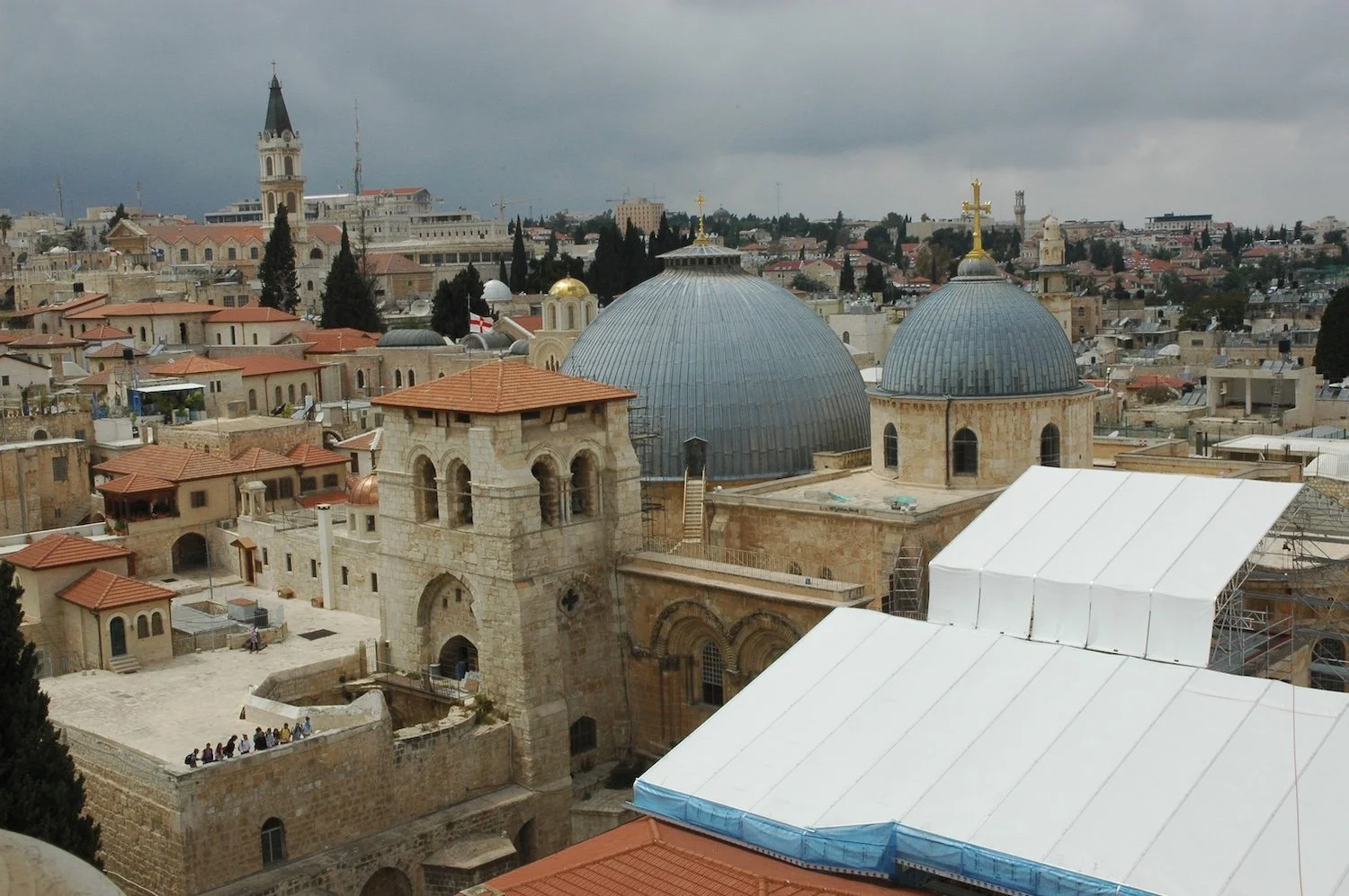 View to the twin (grey) domes of the Church of the Holy Sepulchre.The structure today is surrounded by the Christian Quarter of Jerusalem’s Old City.
