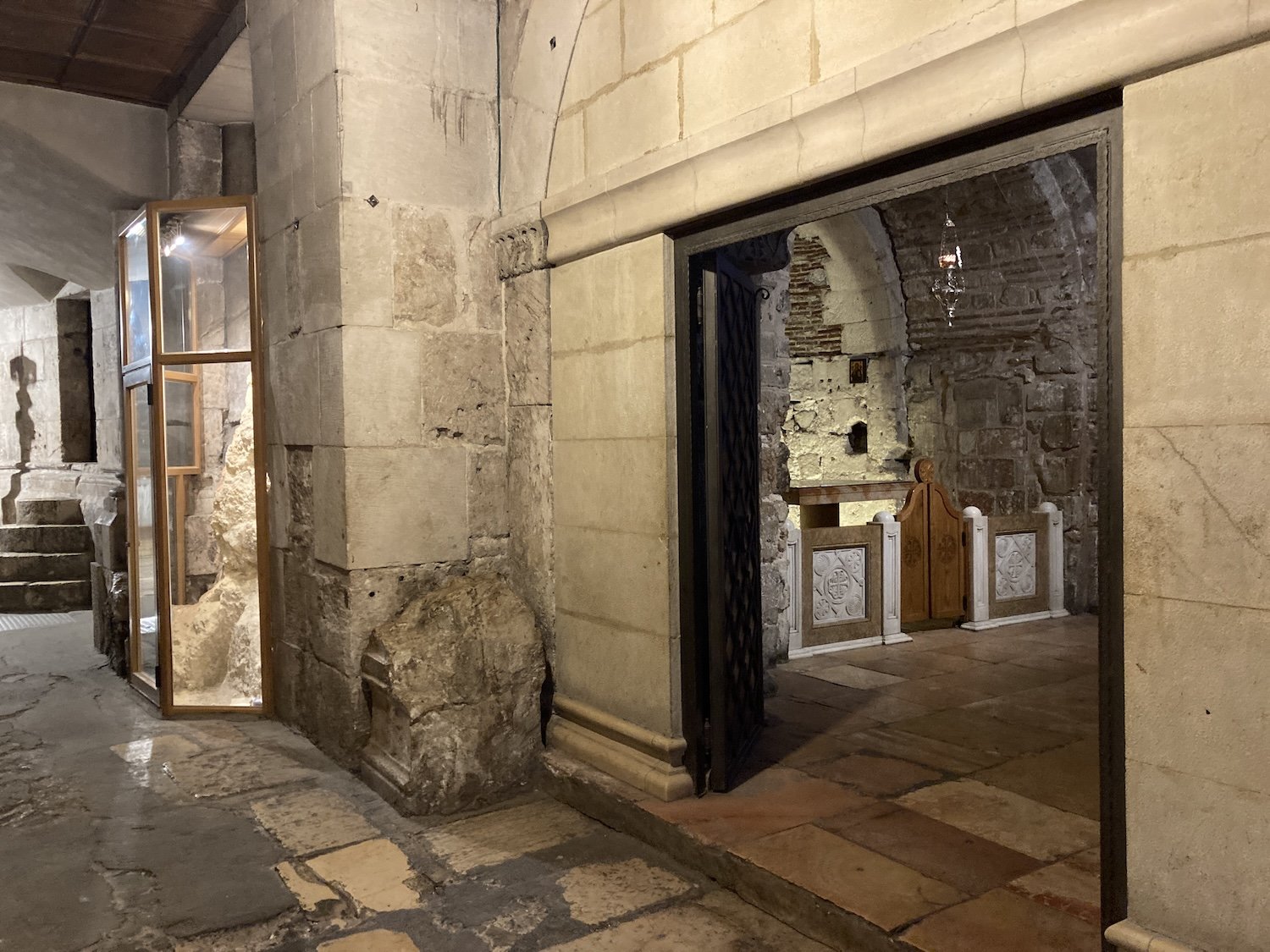The door on the right leads into the Chapel of Adam, immediately under the Greek Orthodox Golgothat site. Portions of the left-behind limestone are visible behind the altar. On the left, parts of this same limestone block are encased in glass.