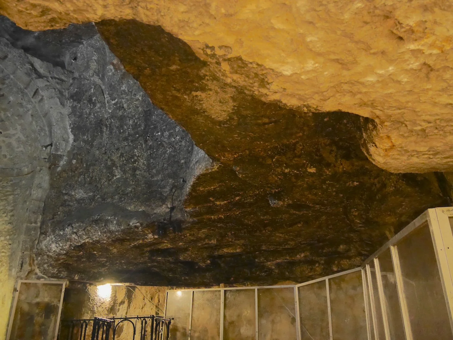 The Chapel of the Finding of the True Cross: In the lowest portion of the building, the quarry work is unmistakable. You can still see pick marks on the walls and the precise, cubical gaps where blocks were hewn out in the walls and ceiling.